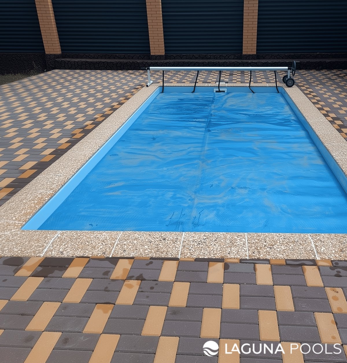 Прямоугольный бассейн с синим покрывалом установлен на площадке с двухцветной тротуарной плиткой.