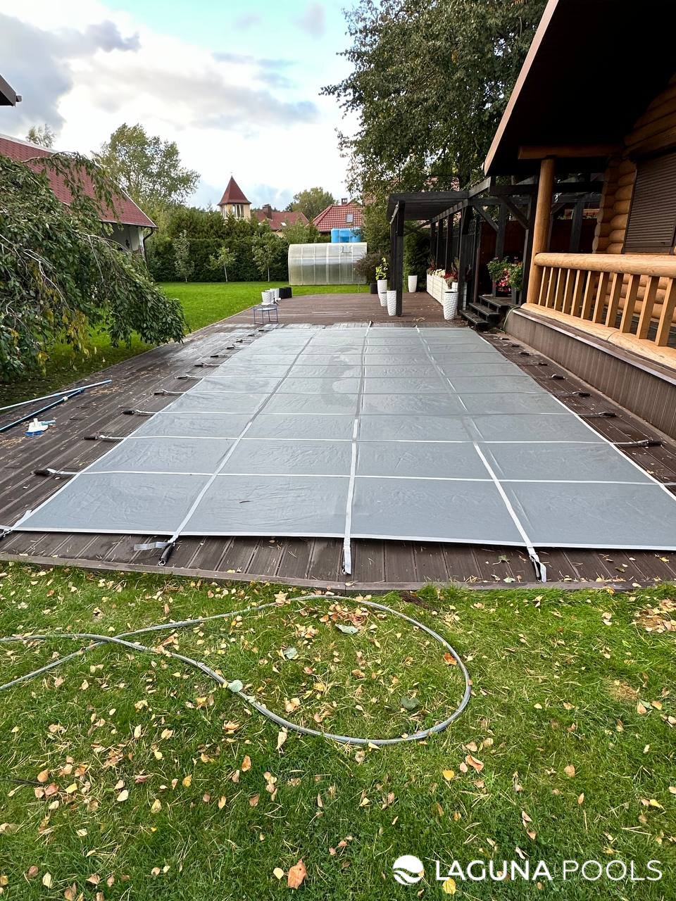 Бассейн с серым защитным покрытием расположен на деревянном настиле во дворе частного дома с газоном и деревьями на заднем плане.